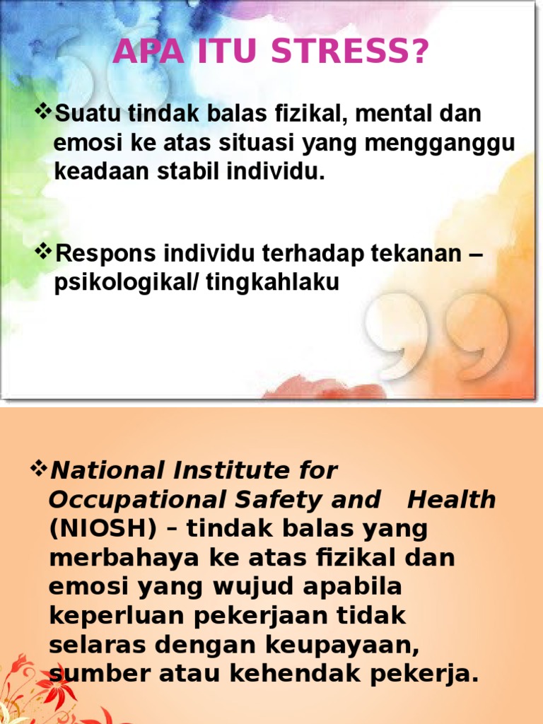 . Tanda-tanda Anda Mangsa Tekanan Mental. Mengantikan bahan yang berhazad dengan bahan yang kurang bahaya. Literatur menunjukkan stres di tempat kerja banyak memberikan kesan negatif tetapi tidak dinafikan ia boleh memberikan impak positif.